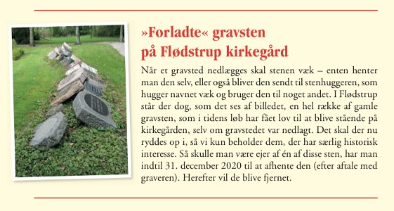 På kirkegården i Flødstrup er et større antal gravsten fra nedlagte gravsteder blevet fjernet og kørt til knusning hos en stenhugger.